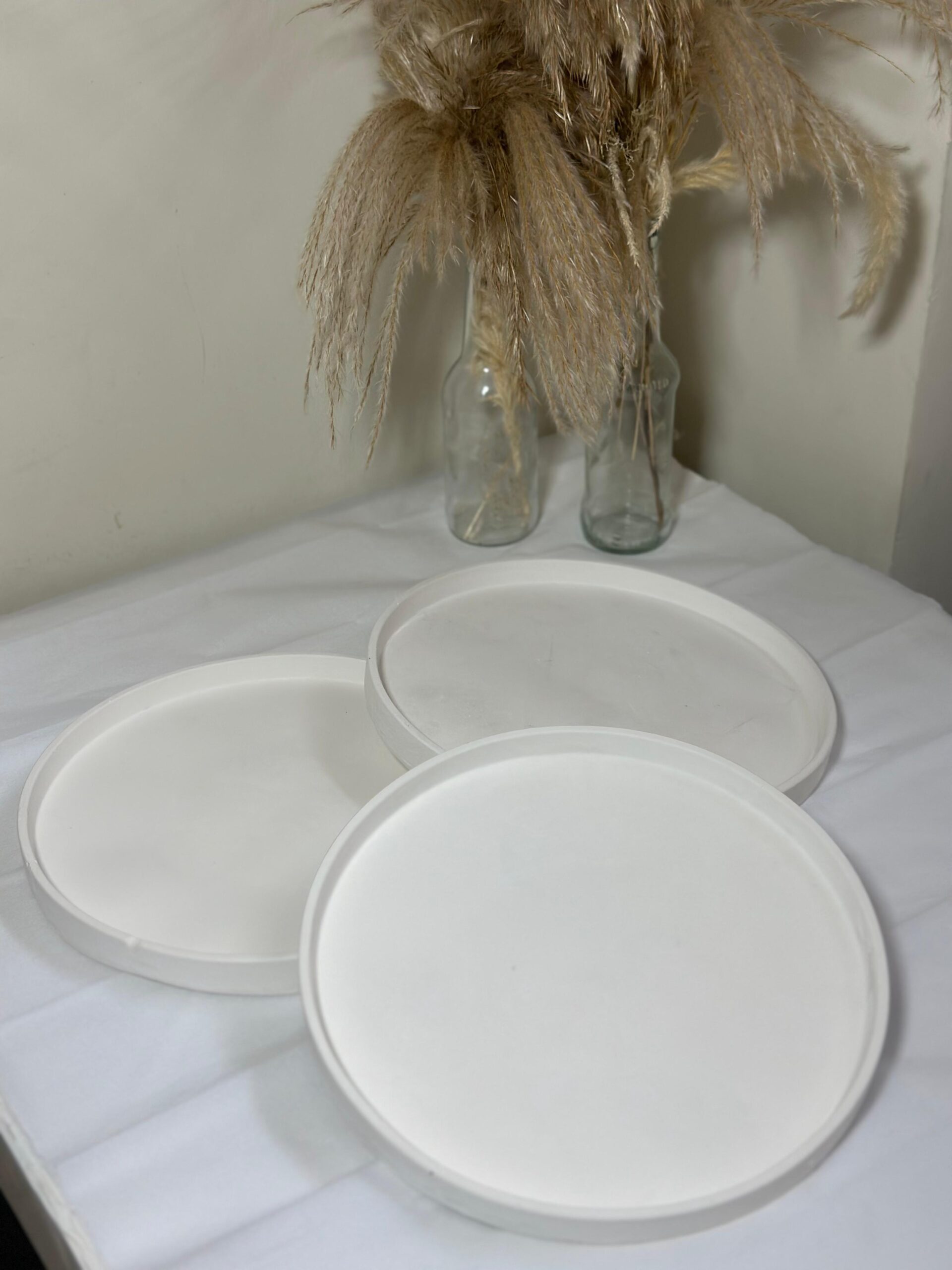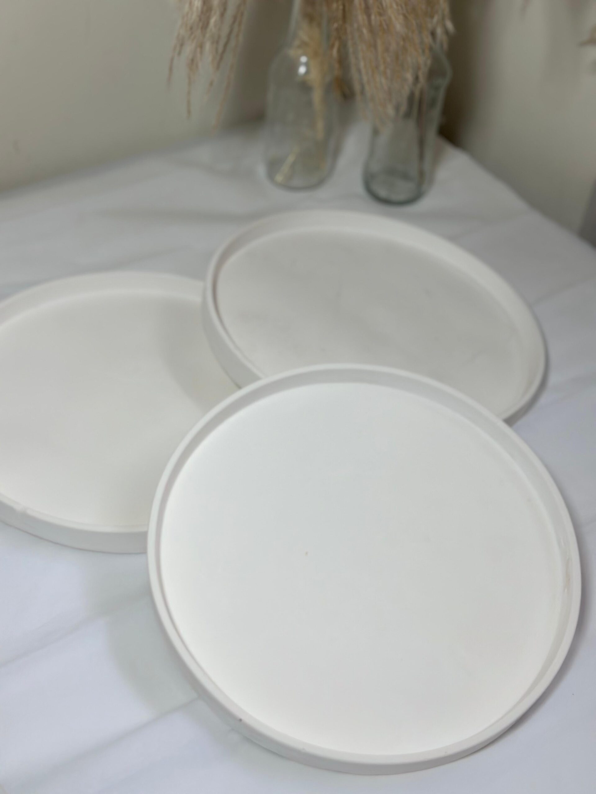 Each tray features a slightly raised rim, providing a subtle containment for items placed on top. Their simple, elegant form makes them highly versatile for both decorative and functional use. They can be used as vanity trays for organizing jewelry and perfumes, as catch-all trays for keys and small essentials by an entryway, or as stylish bases for displaying candles, vases, or other decorative objects. The matte finish and uniform color enhance the focus on the items they hold, making them an ideal choice for creating organized and visually appealing vignettes in any room.